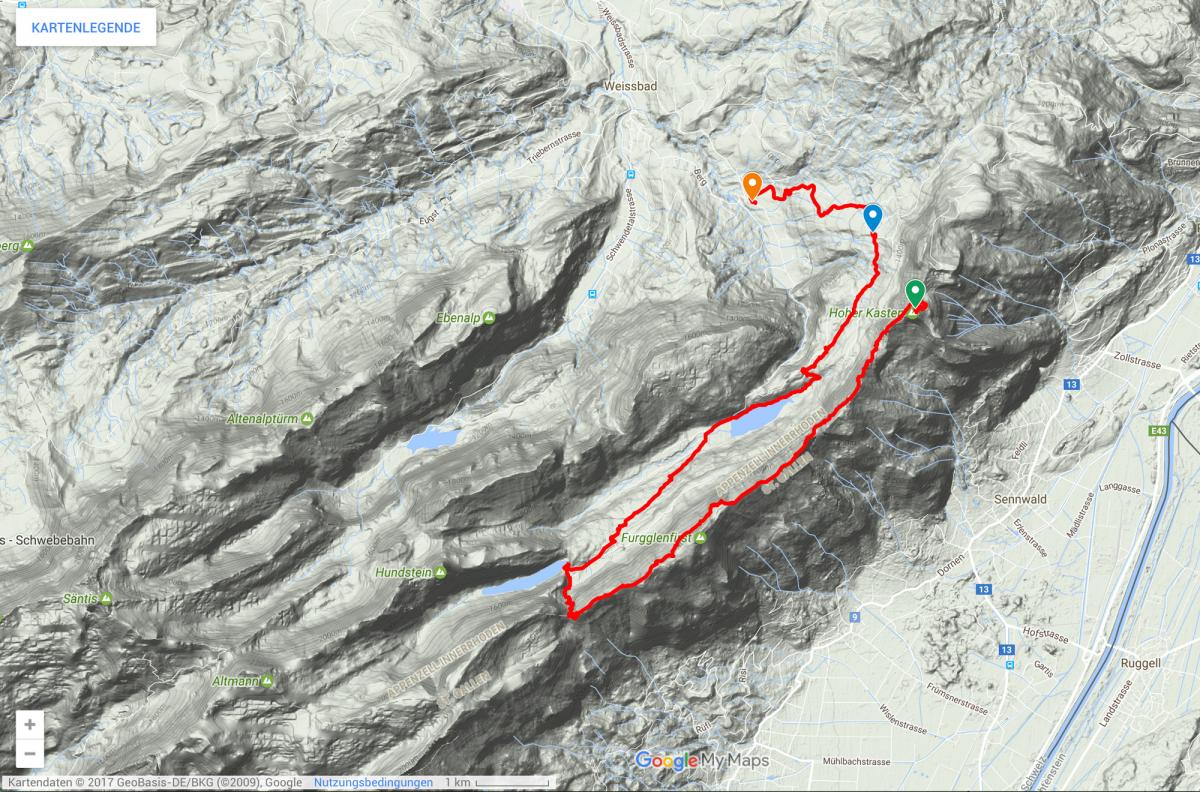 I recorded the track using TrackRec on iPhone and exported it as KML, then imported that to Google Maps. Orange marker: Brülisau (cable car valley station), green marker: Hoher Kasten (summit), blue marker: Restaurant Ruhesitz (kickboard rental). Säntis and Altmann can be seen at the lower left corner.